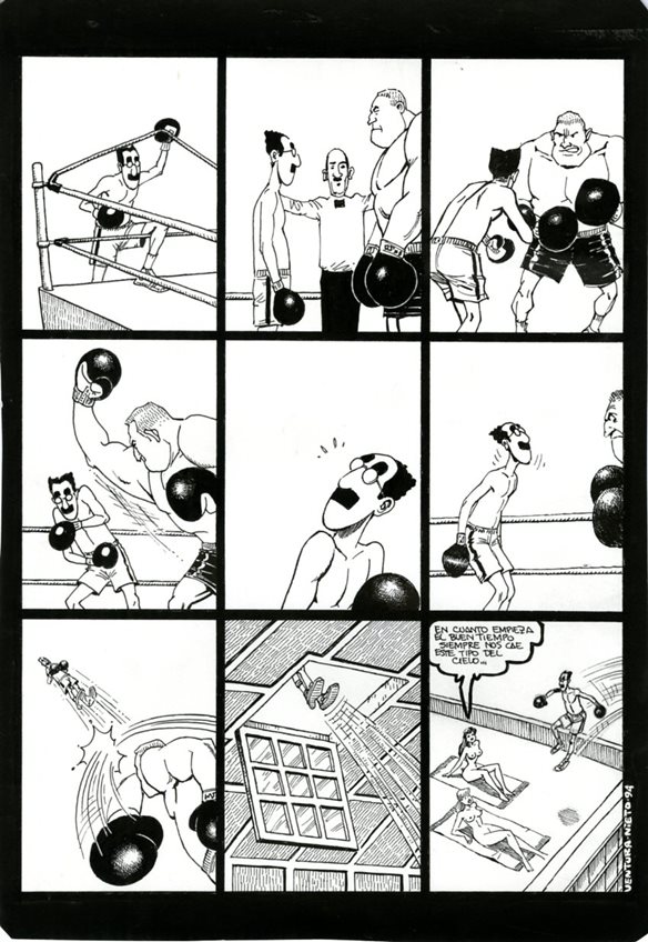 Miguel Angel Nieto (1947 - 1995) y Enrique Ventura (1946). Dúo de historietistas españoles compuesto por el guionista Miguel Ángel Nieto y el dibujante Enrique Ventura, tras el fallecimiento del primero, Ventura continuó trabajando en solitario. Primos y residentes en Madrid, uña y carne tanto en lo personal como en lo profesional.​ Publicaron en 1971 una historieta titulada Sam y la Morsa en la revista infantil Molinete, y al año siguiente estaban trabajando ya para la revista Trinca. Instalados en Barcelona, son contratados en 1974 por la revista "satírica y neurasténica" por excelencia, El Papus, donde eran un rara avis, en el sentido de que lo suyo era el humor desmadrado y socarrón pero tierno a la vez, cuyo dibujo tenía una base técnica realmente impresionante. Posteriormente recalan en El Jueves, donde publicarán su longeva serie Grouñidos en el Desierto.